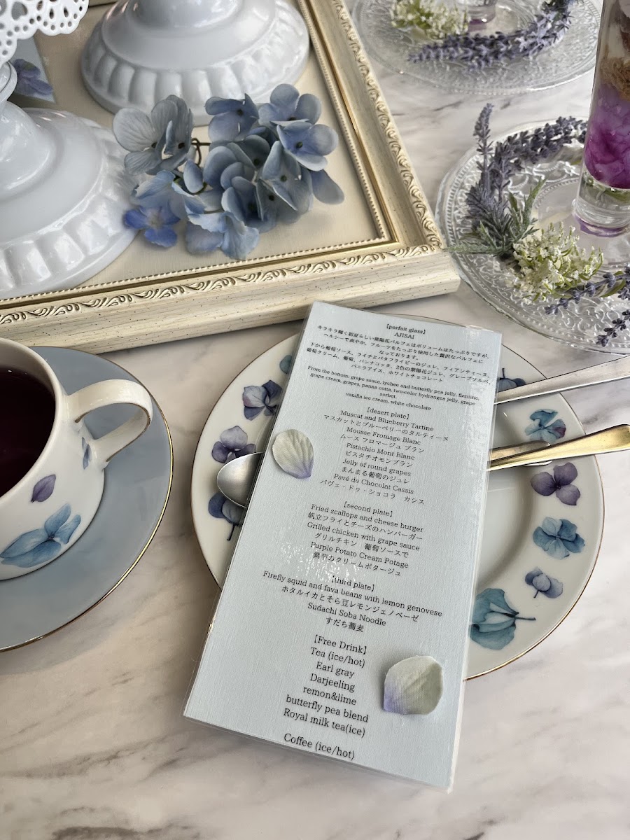 たっぷりフルーツのすずらんsoda、推し色リボン、推し色アーティフィシャルフラワーをご用意し、アフタヌーンティーと推しをご自身でかわいくデコレーション♡ (お花は貸出ですが、使用したリボンはお持ち帰り可能です)
